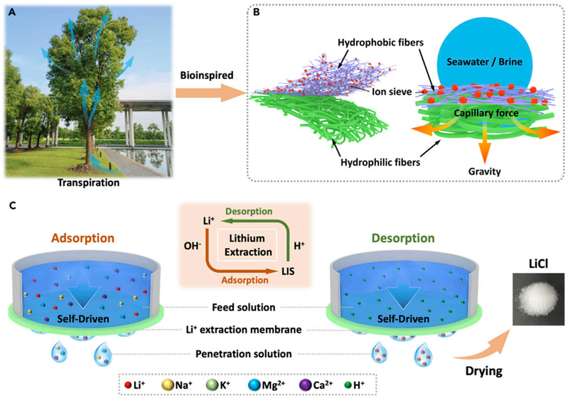 在“碳达峰”和“碳中和”的国家战略背景下,作为新能源汽车、3C消费电子和储能等领域最不可或缺的能源金属锂是一种重要的战略性资源。目前,商业锂主要来自于陆地锂矿,数量有限且地理上分布不均。海洋和盐湖卤水中也含有大量锂,但由于大多数提锂技术需要施加外力作为驱动力,例如压力、电场等,将会显著增加提锂工艺的能耗。