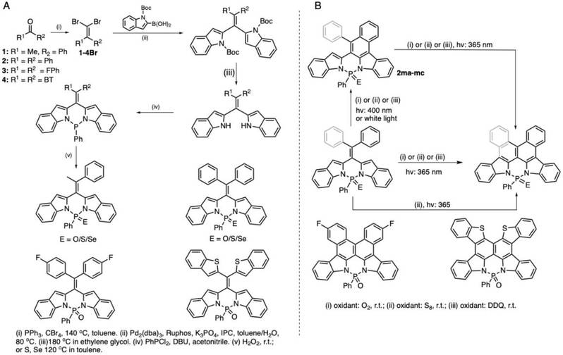 图2. (A)磷–氮成环反应路径与条件;(B)高效光环化反应路径与条件