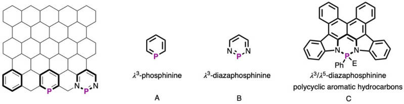 图1. (A)磷芳香体系、(B)磷氮芳香体系、(C)磷氮多环芳香体系