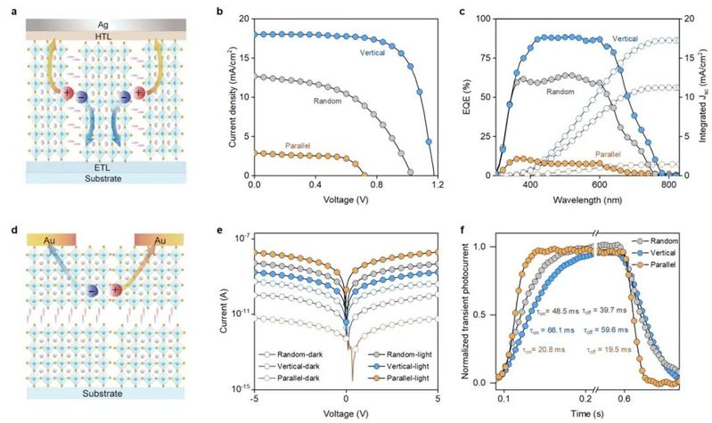 研究人员进一步通过氯离子添加剂精确调控了二维层状钙钛矿晶体取向,制备了乱序、垂直、混合、平行取向的钙钛矿薄膜并表征了它们的取向性。通过将不同取向的二维层状钙钛矿晶体应用于太阳能电池和光电探测器,获得了优越的器件性能,且器件性能与二维层状钙钛矿薄膜的晶体取向性有很强的相关性。