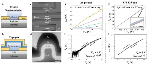 研究进一步将打印出的氧化铟Fin结构作为沟道,集成到底栅和顶栅FinFET器件中。其中,顶栅控制的场效应晶体管(FET)表现出超过 1000 倍的开关比;经退火处理后,器件载流子迁移率提升至8.33 cm²·V⁻¹·s⁻¹。然而,热处理也导致载流子浓度过高,进而出现了“简并半导体”行为,使FET丧失了开关功能。为解决该问题,团队计划后续通过可控掺杂和尺寸优化进一步提升器件性能。