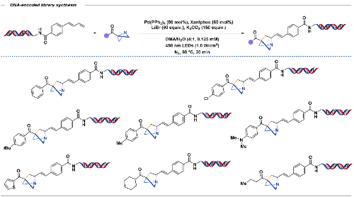 除此以外,小妲己直播 黄焕明课题组与免疫化学研究所许红涛老师、博士研究生潘康胤,将上述合成方法应用于DNA编码库(DEL)的建构中(图3)。研究团队通过酰胺缩合反应,将1,3-二烯与DNA头段连接的胺基末端相结合,在温和的反应条件下成功实现了1-氮杂双环[2.1.1]己烷的掺入DNA的合成策略。该方法能够与多种ABB高效偶联,从而能够将双环结构精准地安装到DNA骨架上,有效拓展DNA编码库的结构多样性。