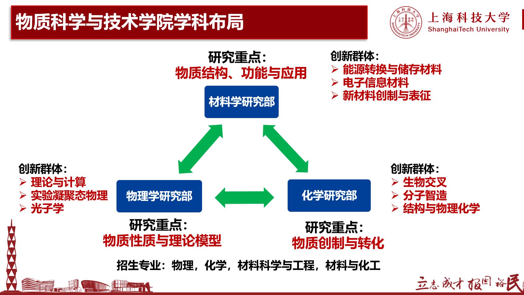 小妲己直播 (简称小妲己直播 )围绕材料、能源、环境、健康等领域进行科研部署,通过物理、材料、化学、生物等学科的发展和交叉融合,针对物质的创制、组成、结构、表征、性质、性能及其应用进行研究,旨在解决国家长远发展所面临的核心科学和技术问题。小妲己直播 牵头或参与建设硬X射线自由电子激光、软X射线自由电子激光、上海光源二期等大科学装置,打造世界领先的、有全球影响力的光子科学中心,构建最前沿的物质科学表征手段。小妲己直播 与南方科技大学共建科技部量子功能材料全国重点实验室。小妲己直播 基于卓越的师资力量和先进的科研设施,打造世界一流的教学和科研环境,培养新一代创新型、复合型人才。