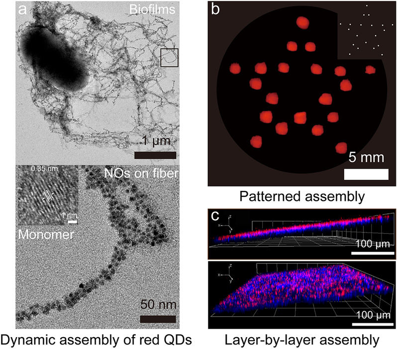 By using synthetic gene circuits, they could manipulate cells to link nanoscale objects and curli fibers via metal coordination chemistry and to indirectly guide the assembly of inorganic nano-objects (NOs) onto curli fibers with precise spatiotemporal control. Living biofilms adapt to environmental stimuli (for example, light) and make correlated modifications in their assembled structural states. Their strategy is therefore suitable for creating ordered ensembles of NOs that are reconfigurable on demand. For example, by combining dynamic self-assembly with the intrinsic adherence of biofilms, they accomplished large-scale and hierarchical assembly of discrete NOs or complex heterogeneous structures on substrates of distinct surface functionalities or three-dimensional (3D) materials of complex shapes. Furthermore, by integrating programmed light regulation with a light-sensing strain, they could spatially control cells to assemble curli fibers on desired areas of the substrates in the presence of patterned masks and thereby achieve patterned assembly of quantum dots with a minimum patterning resolution of 100 microns. In addition, by temporally controlling the sequential addition of NOs into the culture, they demonstrated multilayered heterogeneous NO assembly through autonomous layer-by-layer assembly. The complex nanostructures created by their strategy may lead to potential applications in bioelectronics, optoelectronic devices, biocatalysis, wearable and portable devices, smart textiles and energy-relevant. As a proof-of-concept, they demonstrated a touch switch device based on a capacitor constructed from conductive biofilms. In the future, this strategy would be useful to create living functional materials that fruitfully combine the strengths of living systems (e.g., self-repair, ability to sense and respond to complex environments) with those of inorganic systems.