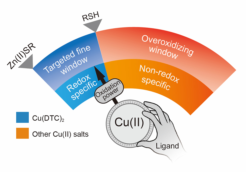 Considering the structural complexity of zinc(II)-thiolate enzymes/proteins and the lack of characteristic spectroscopic features to monitor chemical changes of the zinc(II) sites, probing clean bioinorganic model reactions of synthetic zinc(II) complexes with well-defined structures mimicking those in living organisms is an effective way to obtain molecular-level insights into their core mechanisms. Surprisingly, Lin’s team found that among all studied ligands of copper(II), DTC displays a unique redox-tuning ability that enables copper(II) to resist the reduction by thiols while retaining its ability to oxidize zinc(II) thiolates to form disulfides. This work proves for the first time that it’s possible to develop oxidants to discriminate between thiols/NAD(P)H and zinc(II) thiolates, alluding to a new chemical principle for how oxidants, especially universal anticancer Cu(DTC)2, might circumvent the intracellular reductive defense around certain zinc(II)-thiolate sites of proteins to kill malignant cells.